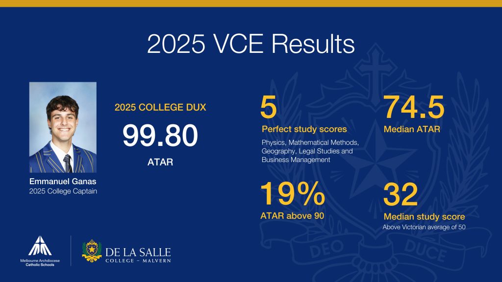 De La Salle College Malvern proudly celebrates the outstanding VCE achievements of the Class of 2025. These exceptional results reflect the dedication, resilience and ambition of our students, supported by the expertise and care of our teachers and the strong partnership we share with families across our community.